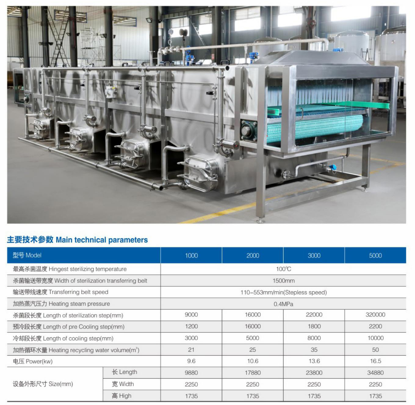 连续喷淋式杀菌机是在吸收、消化国外样机的基础上设计而成。采用循环温水预热、循环热水杀菌、循环温水预冷,再用冷却水喷淋冷却,四段处理形式;具有杀菌温度自动控制,杀菌时间无级可调等优点,能广泛应用于各种瓶装、罐装酸性果汁饮料、电解质饮料、酒类、调味品等产品的杀菌冷却。设备可根据用户提出的杀菌条件及产量要求进行设计。