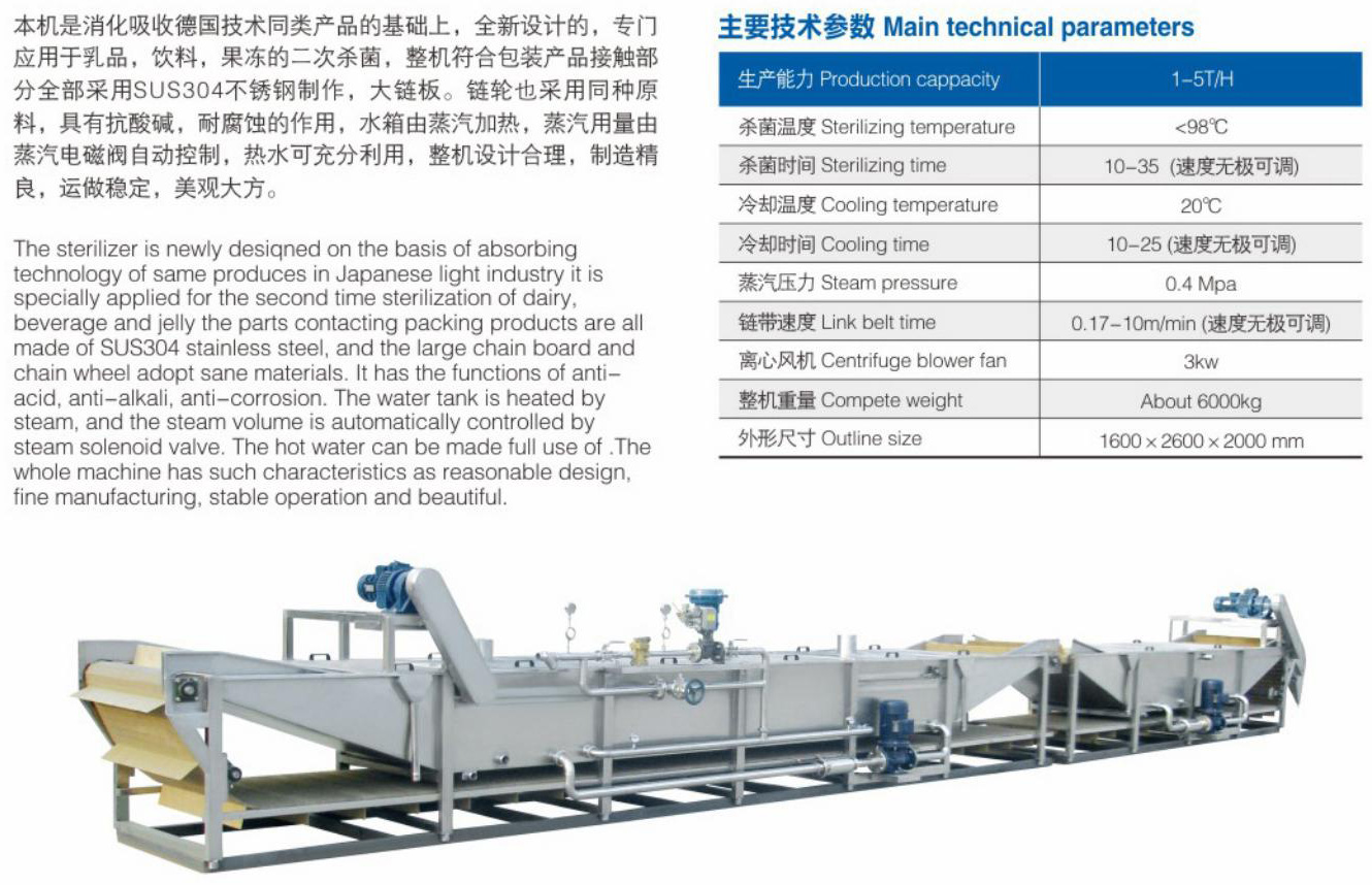 本机是消化吸收德国技术同类产品的基础上,全新设计的,专门应用于乳品,饮料,果冻的二次杀菌,整机符合包装产品接触部分全部采用SUS304不锈钢制作,大链板。链轮也采用同种原料,具有抗酸碱,耐腐蚀的作用,水箱由蒸汽加热,蒸汽用量由蒸汽电磁阀自动控制,热水可充分利用,整机设计合理,制造精良,运做稳定,美观大方。