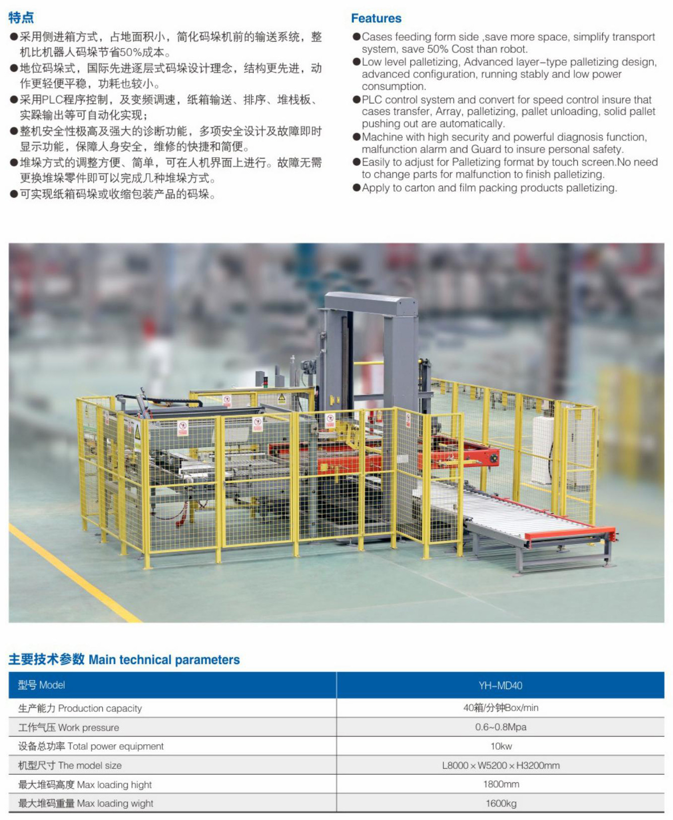 采用侧进箱方式,占地面积小,简化码垛机前的输送系统,整机比机器人码垛节省50%成本。地位码垛式,国际先进逐层式码垛设计理念,结构更先进,动作更轻便平稳,功耗也较小。采用PLC程序控制,及变频调速,纸箱输送、排序、堆板、实跺输出等可自动化实现;整机安全性极高及强大的诊断功能,多项安全设计及故障即时显示功能,保障人身安全,维修的快捷和简便。堆垛方式的调整方便、简单,可在人机界面上进行。故障无需更换堆垛零件即可以完成几种堆垛方式。可实现纸箱码垛或收缩包装产品的码垛。