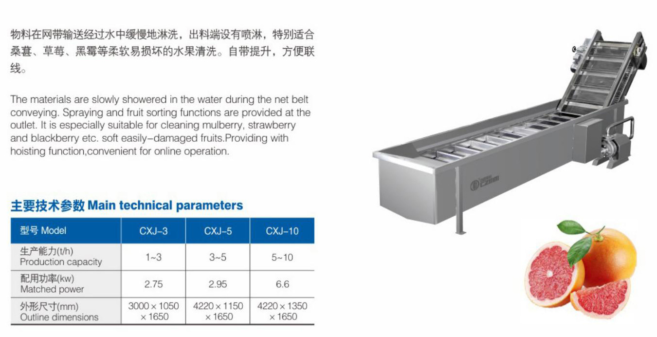 物料在网带输送经过水中缓慢地淋洗,出料端设有喷淋,特别适合桑葚、草莓、黑霉等柔软易损坏的水果清洗。自带提升,方便联线。