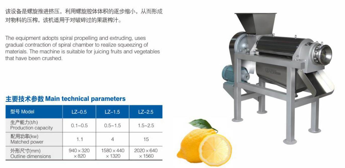 该设备是螺旋推进挤压,利用螺旋腔体体积的逐步缩小,从而形成对物料的压榨,该机适用于对破碎过的果蔬榨汁。