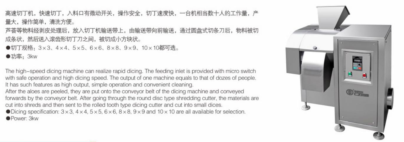 高速切丁机,快速切丁,入料口有微动开关,操作安全,切丁速度快,一台机相当数十人的工作量,产量大,操作简单,清洗方便。芦荟等物料经剥皮处理后,放入切丁机输送带上,由输送带向前输送,通过圆盘式切条刀后,物料被切成条状,然后送入滚齿形切丁刀之间,被切成小方块状。