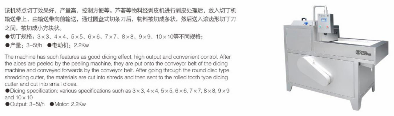该机特点切丁效果好,产量高,控制方便等。芦荟等物料经剥皮机进行剥皮处理后,放入切丁机输送带上,由输送带向前输送,通过圆盘式切条刀后,物料被切成条状,然后送入滚齿形切丁刀之间,被切成小方块状。