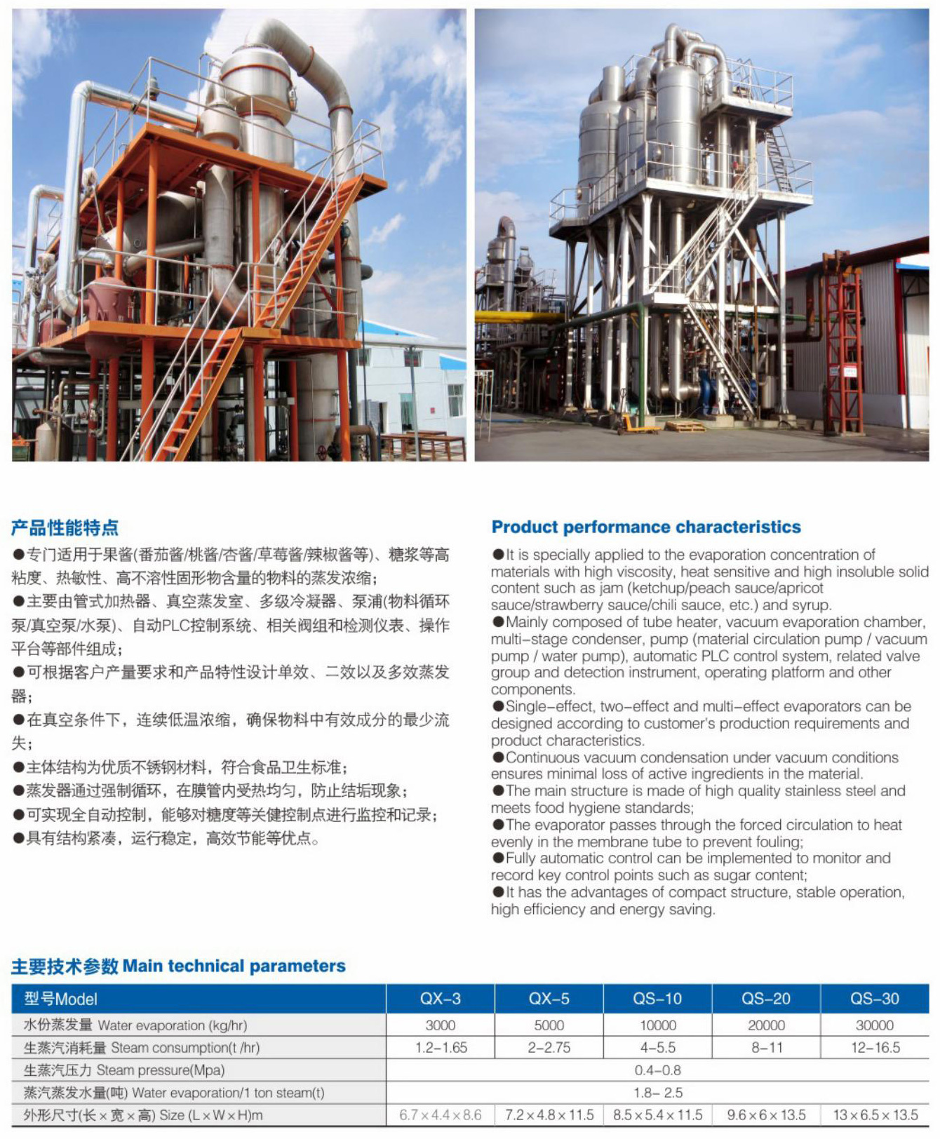 ●专门适用于果酱(番茄酱/桃酱/杏酱/草莓酱/辣椒酱等)、糖浆等高粘度、热敏性、高不溶性固形物含量的物料的蒸发浓缩;
