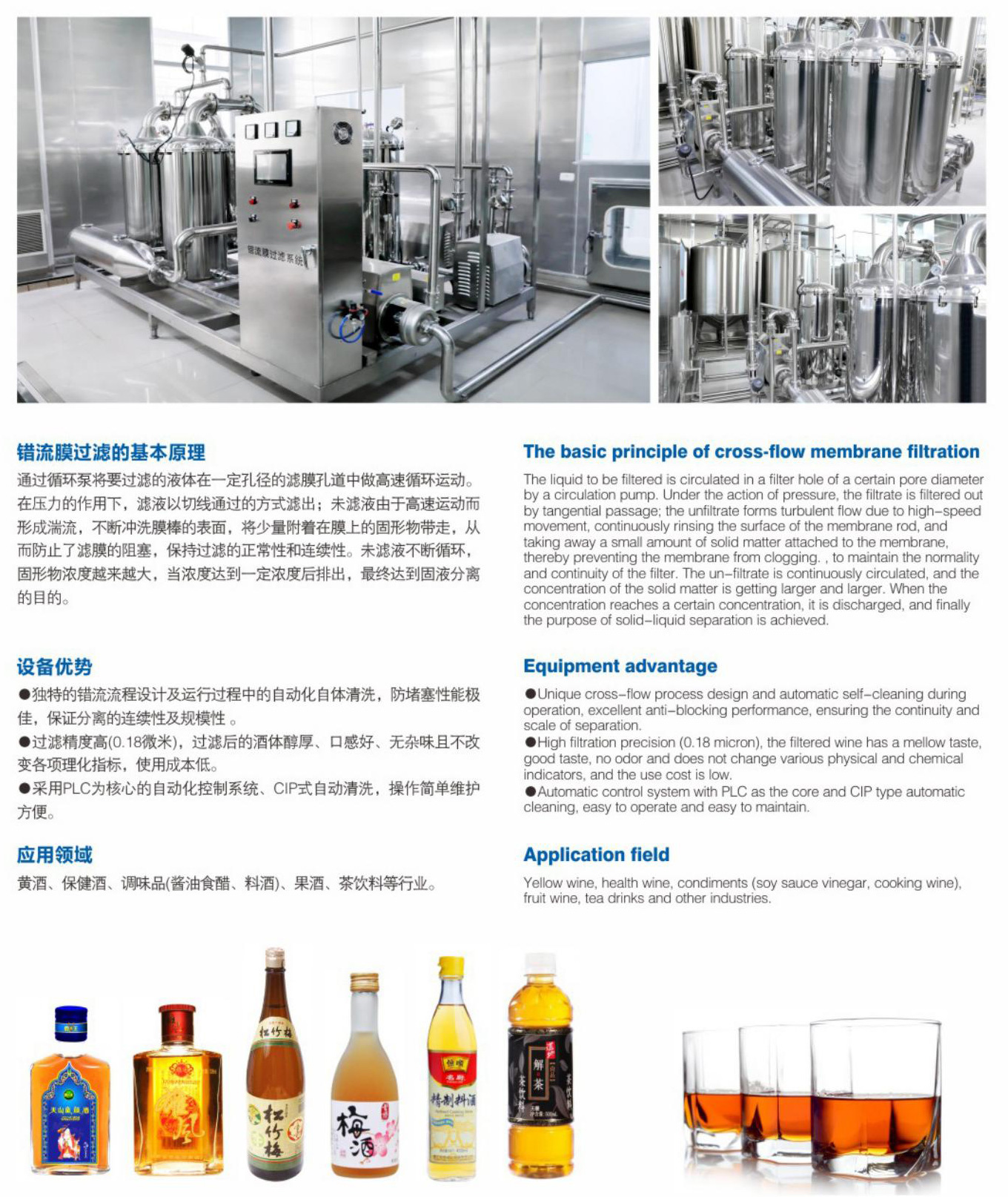 通过循环泵将要过滤的液体在一定孔径的滤膜孔道中做高速循环运动。在压力的作用下,滤液以切线通过的方式滤出;未滤液由于高速运动而形成湍流,不断冲洗膜棒的表面,将少量附着在膜上的固形物带走,从而防止了滤膜的阻塞,保持过滤的正常性和连续性。未滤液不断循环,固形物浓度越来越大,当浓度达到一定浓度后排出,最终达到固液分离的目的。