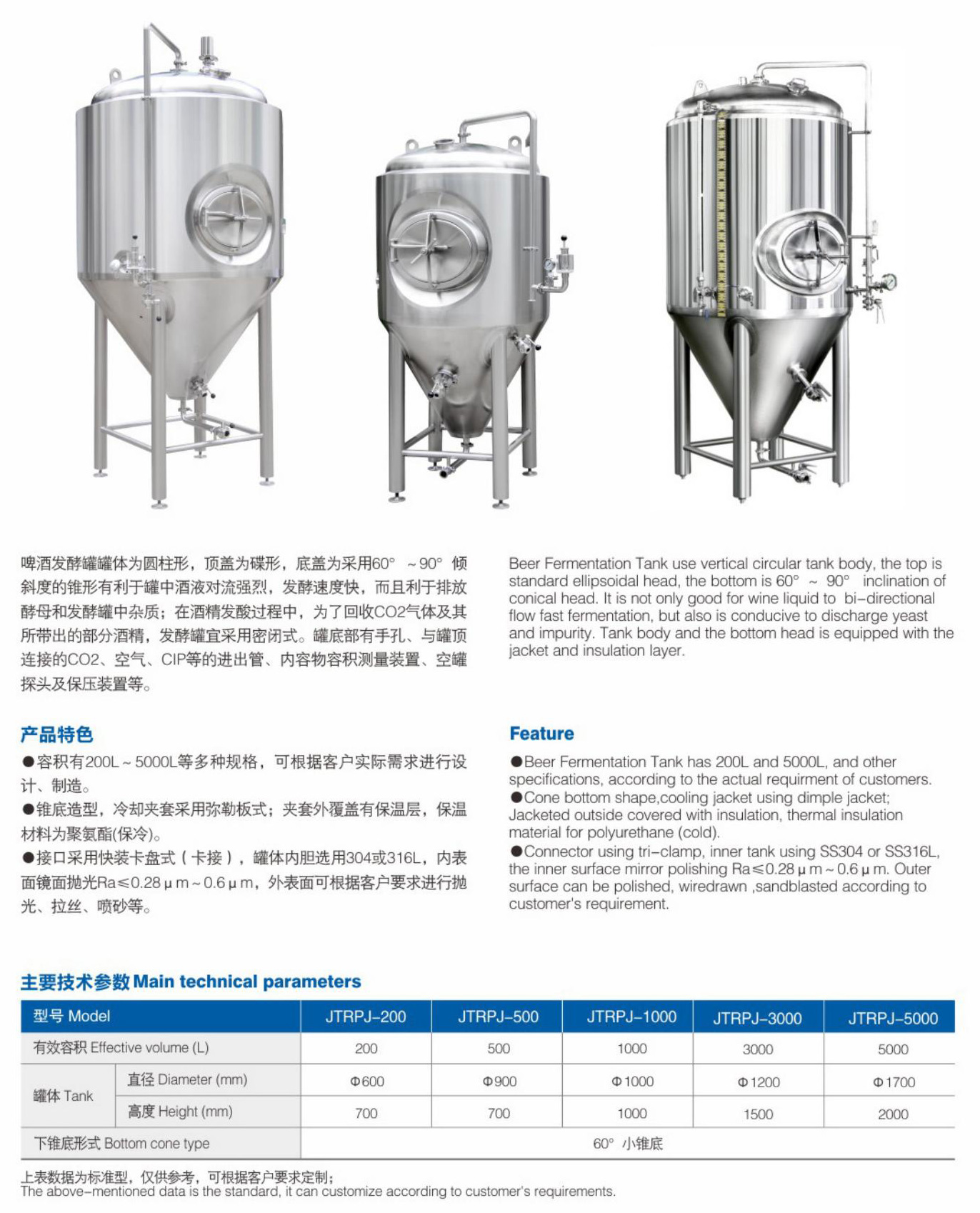 啤酒发酵罐罐体为圆柱形,顶盖为碟形,底盖为采用60°~90°倾斜度的锥形有利于罐中酒液对流强烈,发酵速度快,而且利于排放酵母和发酵罐中杂质;在酒精发酸过程中,为了回收C02气体及其所带出的部分酒精,发酵罐宜采用密闭式。罐底部有手孔、与罐顶连接的CO2、空气、CIP等的进出管、内容物容积测量装置、空罐探头及保压装置等。