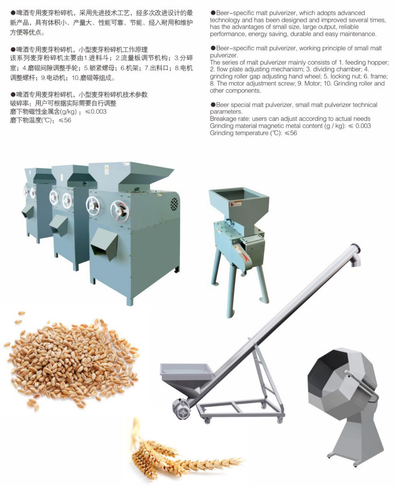●啤酒专用麦芽粉碎机,小型麦芽粉碎机技术参数破碎率:用户可根据实际需要自行调整磨下物磁性金属含(g/kg):≤0.003磨下物温度(℃):≤56