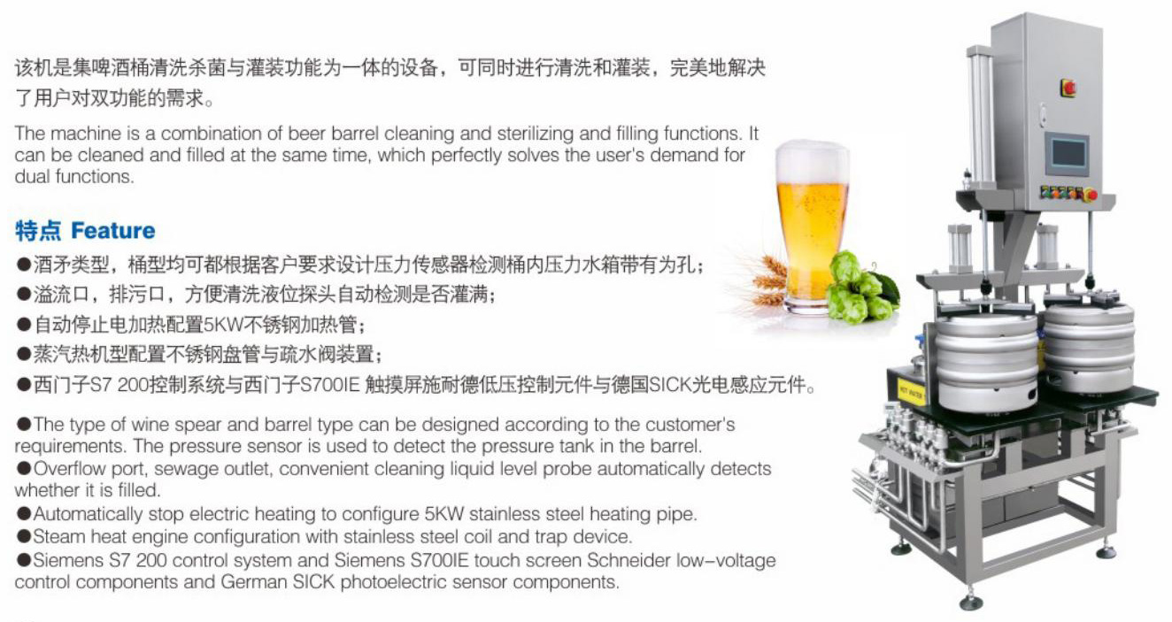 该机是集啤酒桶清洗杀菌与灌装功能为一体的设备,可同时进行清洗和灌装,完美地解决了用户对双功能的需求。