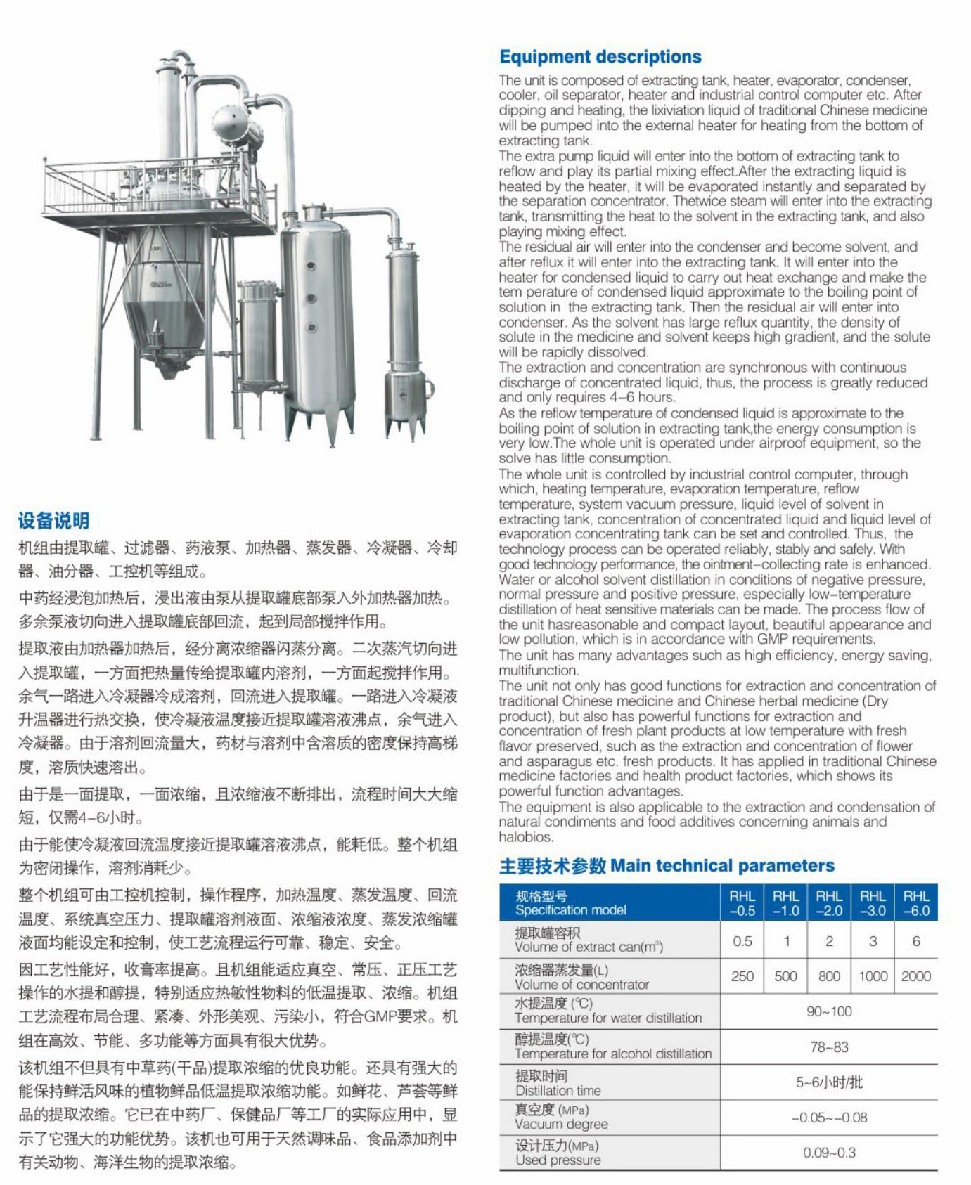 机组由提取罐、过滤器、药液泵、加热器、蒸发器、冷凝器、冷却器、油分器、工控机等组成。