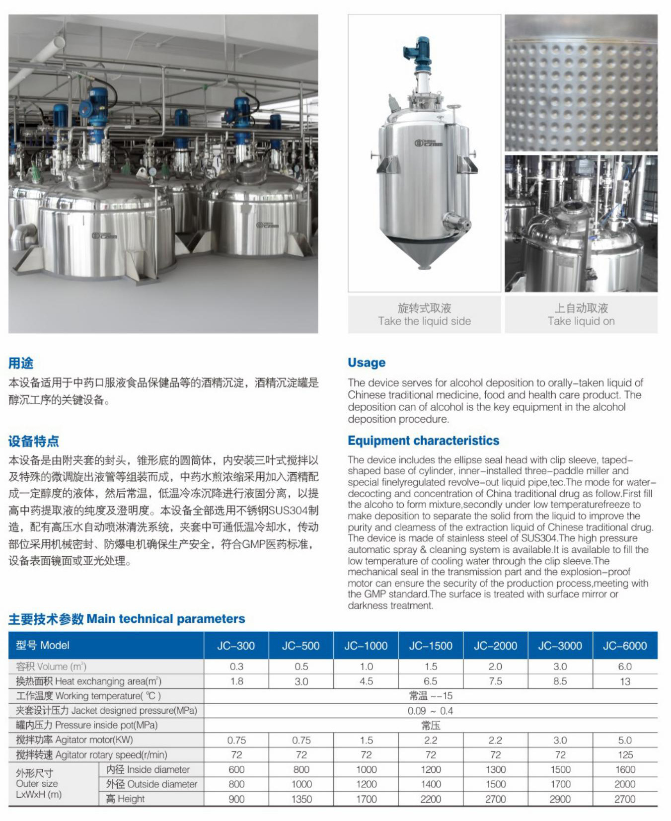 本设备是由附夹套的封头,锥形底的圆筒体,内安装三叶式搅拌以及特殊的微调旋出液管等组装而成,中药水煎浓缩采用加入酒精配成一定醇度的液体,然后常温,低温冷冻沉降进行液固分离,以提高中药提取液的纯度及澄明度。本设备全部选用不锈钢SUS304制造,配有高压水自动喷淋清洗系统,夹套中可通低温冷却水,传动部位采用机械密封、防爆电机确保生产安全,符合GMP医药标准,设备表面镜面或亚光处理