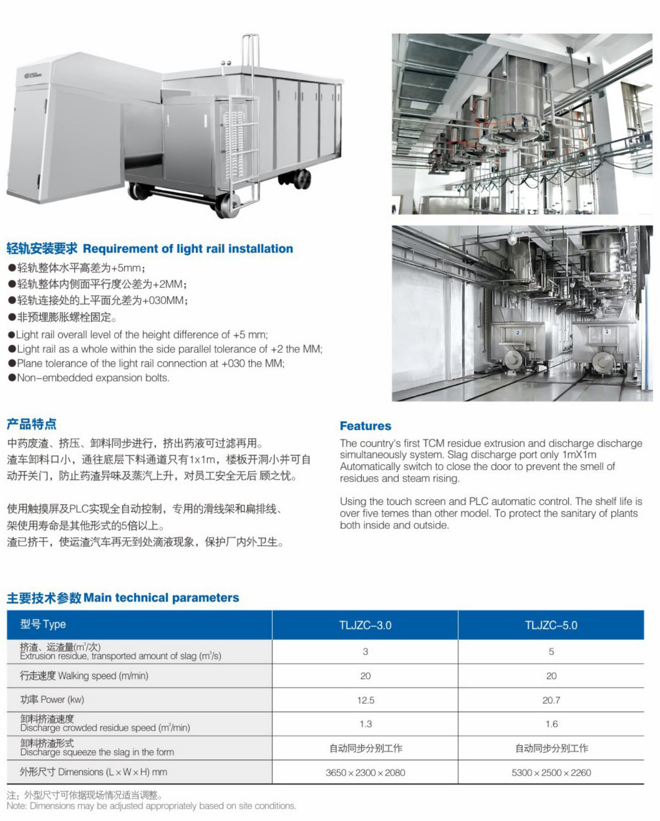 中药废渣、挤压、卸料同步进行,挤出药液可过滤再用。渣车卸料口小,通往底层下料通道只有1x1m,楼板开洞小并可自动开关门,防止药渣异味及蒸汽上升,对员工安全无后顾之忧。
