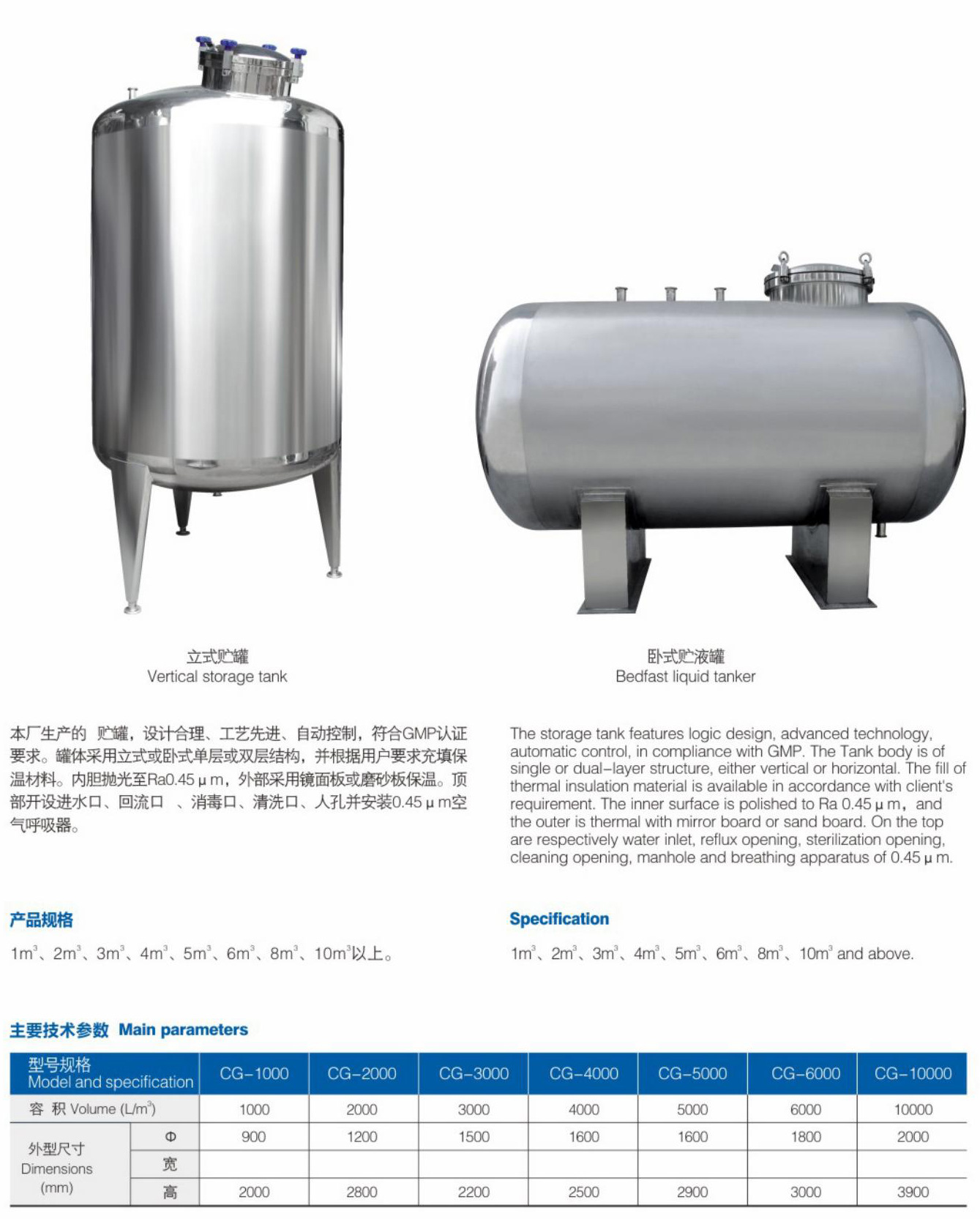 本厂生产的 贮罐,设计合理、工艺先进、自动控制,符合GMP认证要求。罐体采用立式或卧式单层或双层结构,并根据用户要求充填保温材料。内胆抛光至Ra0.45um,外部采用镜面板或磨砂板保温。顶部开设进水口、回流口、消毒口、清洗口、人孔并安装0.45um空气呼吸器。