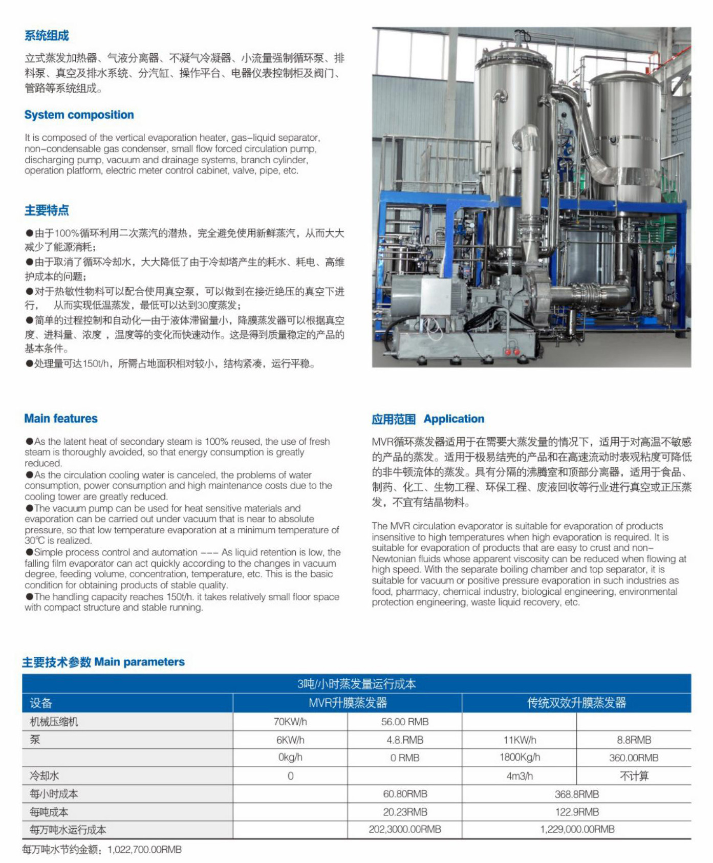 立式蒸发加热器、气液分离器、不凝气冷凝器、小流量强制循环泵、排料泵、真空及排水系统、分汽缸、操作平台、电器仪表控制柜及阀门、管路等系统组成。