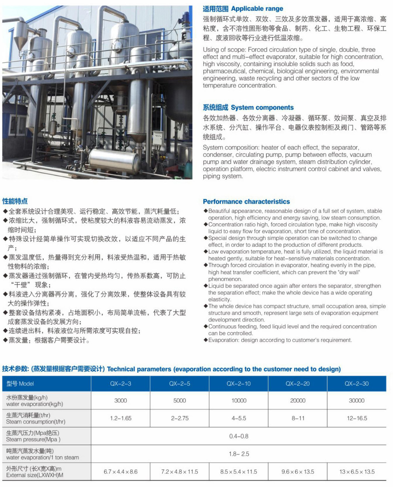 强制循环式单效、双效、三效及多效蒸发器,适用于高浓缩、高粘度,含不溶性固形物等食品、制药、化工、生物工程、环保工程、废液回收等行业进行低温浓缩。