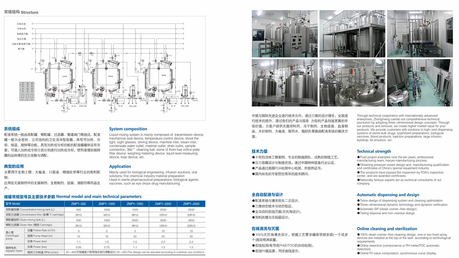 配液系统一般由浓配罐、稀配罐、过滤器、管道阀门等组成。配液罐一般为全密封、立式结构的卫生洁净型容器,具有可加热、冷却、保温、搅拌等功能。具有加热或冷却功能的配液罐罐体设有夹套,可通入加热或冷却介质分别进行加热或冷却,使药液借助搅拌器的运转得到充分溶解与调配。