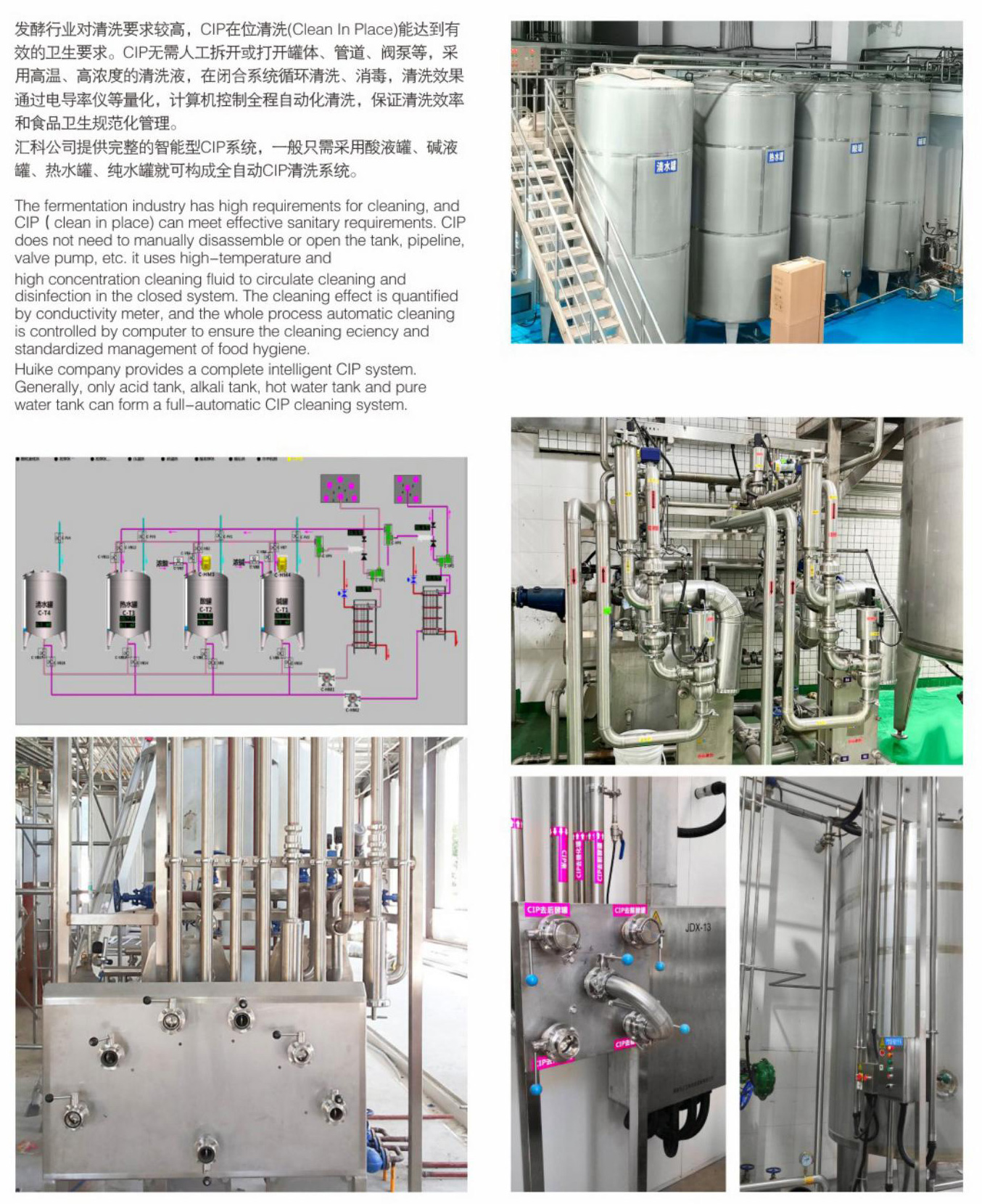 汇科公司提供完整的智能型CIP系统,一般只需采用酸液罐、碱液罐、热水罐、纯水罐就可构成全自动CIP清洗系统。