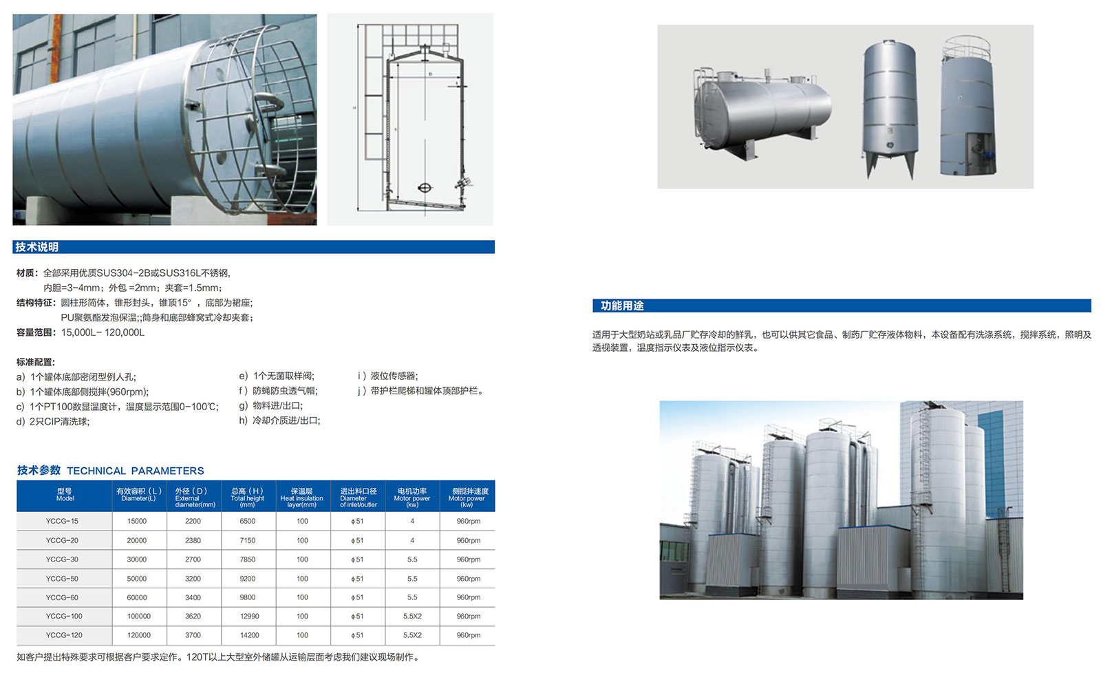 适用于大型奶站或乳品厂贮存冷却的鲜乳,也可以供其它食品、制药厂贮存液体物料,本设备配有洗涤系统,搅拌系统,照明及透视装置,温度指示仪表及液位指示仪表。