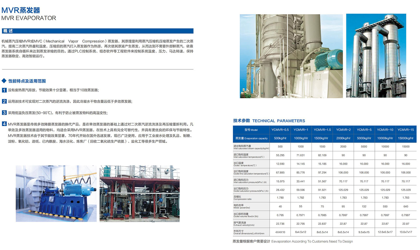 机械蒸汽压缩MVR或MVC(Mechanical Vapor Compression)蒸发器,其原理是利用蒸汽压缩机压缩蒸发产生的二次蒸汽,提高二次蒸汽热量和温度,压缩后的蒸汽打入蒸发器作为热源,再次使其原液产生蒸发,从而达到不需要外部鲜蒸汽,依靠蒸发器系统自循环来达到蒸发浓缩的目的。通过PLC控制系统、组态软件等工程软件来控制系统温度、压力、马达转速,保持蒸发器稳定、高效智能运行。