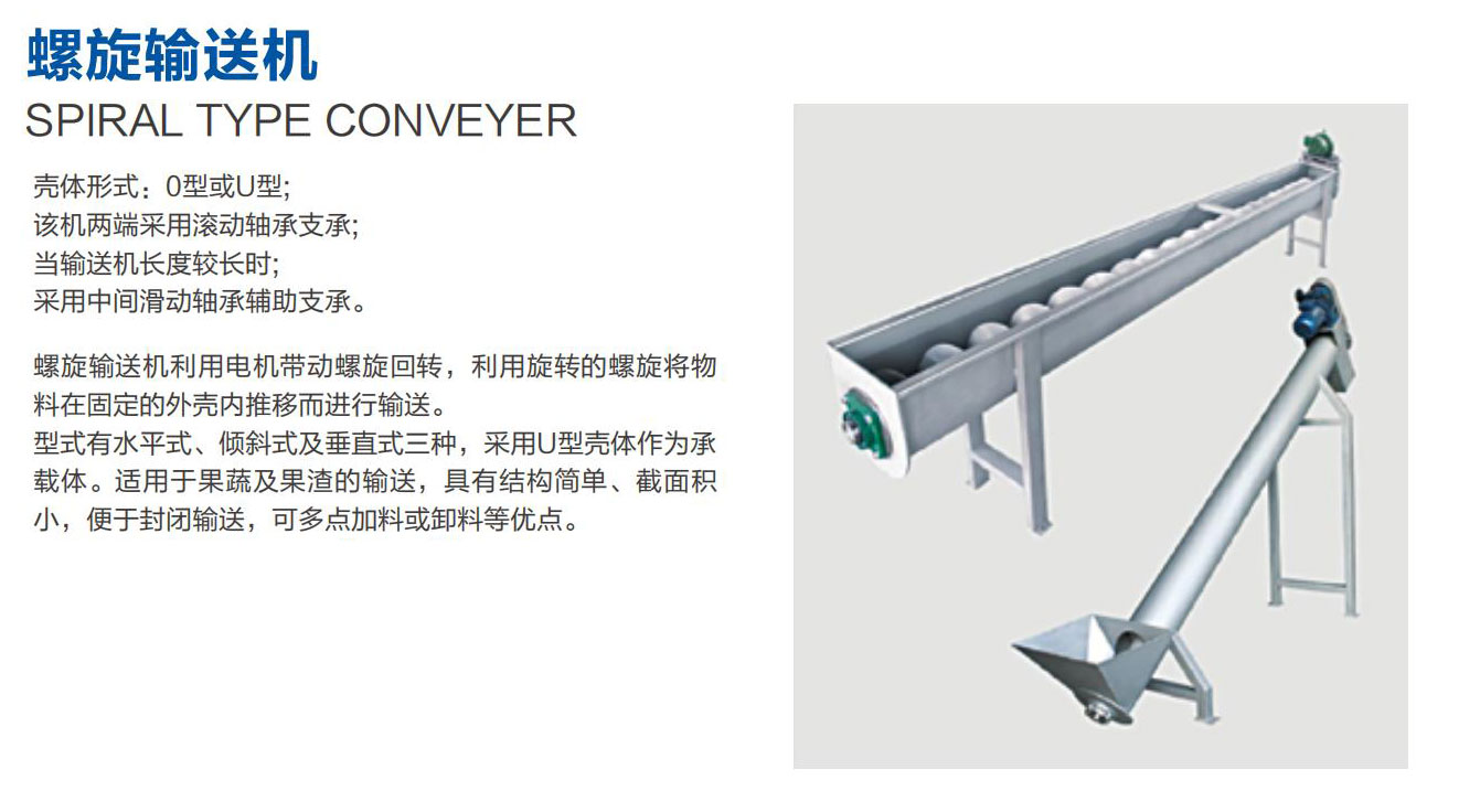 螺旋输送机利用电机带动螺旋回转,利用旋转的螺旋将物料在固定的外壳内推移而进行输送。型式有水平式、倾斜式及垂直式三种,采用U型壳体作为承载体。适用于果蔬及果渣的输送,具有结构简单、截面积小,便于封闭输送,可多点加料或卸料等优点。